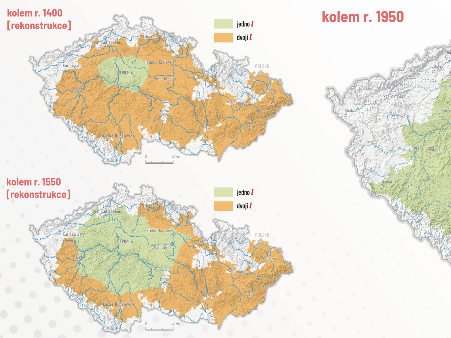 Stupňánek, B., Vondráková, A. Ústup dvojího l během 20. století. Měřítko 1 : 1 400 000 (4 mapy) a 1 : 2 500 000 (2 mapy). 70×100 cm. Olomouc: Univerzita Palackého v Olomouci, Edice M·A·P·S· Num. 22, 1 s., 2022. ISBN 978-80-244-6160-1 (print), 978-80-244-6164-9 (iPDF). DOI: 10.5507/prf.22.24461601