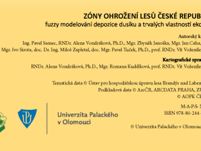 SAMEC, P., VONDRÁKOVÁ, A., CAHA, J., JANOŠKA, Z., SIROTA, I., ZAPLETAL, M., TUČEK, P., VOŽENÍLEK, V. Zóny ohrožení lesů České republiky: fuzzy modelování depozice dusíku a trvalých vlastností ekotopu. Edice M·A·P·S· (Map and Atlas Products Series), Num. 8. Olomouc: Univerzita Palackého v Olomouci, 2016, 1 mapový list, měřítko 1 : 500 000. ISBN 978-80-244-4940-1